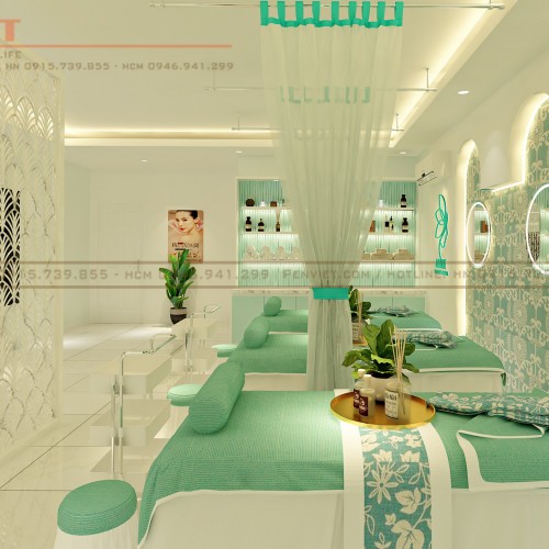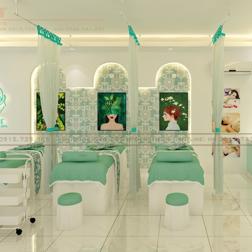 Chúng tôi tư vấn cho chủ đầu tư setup cửa tiệm theo phong cách hiện đại, sử dụng gam màu nhẹ nhàng như xanh kết hợp với trắng để làm toát lên tinh thần của mẫu thiết kế spa đẹp. Bên cạnh đó, những gam màu này còn giúp ánh sáng phản xạ và luân chuyển tốt hơn, tạo hiệu ứng thị giác mở rộng không gian.