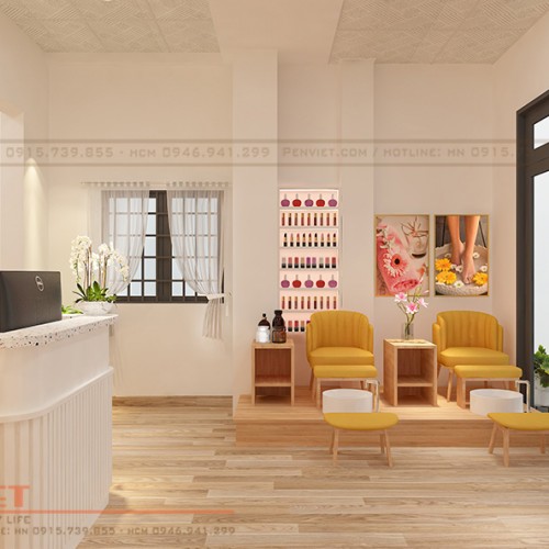 Kiến trúc sư cũng khéo léo tận dụng không gian setup hệ bàn ghế làm móng chuyên dụng đầy đủ ghế ngồi, đôn, kê chân và chậu. Ngoài ra, bên cạnh ghế ngồi còn được chúng tôi đặt các tab nhỏ để đồ làm nail cho không gian gọn gàng hơn.