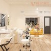 Bên cạnh đó, PenViet cũng bố trí bàn trang điểm bằng gỗ MDF phủ melamine, gương soi và bóng đèn xung quanh kết hợp cùng với ghế chân inox, nệm bọc nỉ màu vàng giúp khách hàng có thể ngắm nhìn mình sau thi trải nghiệm dịch vụ tại đây.