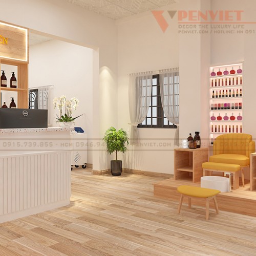 Phía sau, kiến trúc sư sử dụng giá kệ để đồ nail vừa tận dụng trưng bày sản phẩm, mẫu mã để giúp khách hàng dễ dàng lựa chọn cũng như tăng thêm phần sinh động cho không gian.