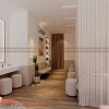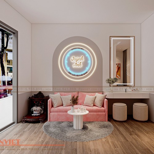 Khu vực tiếp đón khách hàng, nhằm cho thấy sự chu đáo và chất lượng dịch vụ của thiết kế spa, Penviet sử dụng bộ sofa màu hồng vô cùng bắt mắt kết hợp với bàn trà với thiết kế đơn giản bằng gỗ MDF chống ẩm giúp khách hàng cảm thấy thoải mái, dễ chịu khi đến đây làm đẹp.