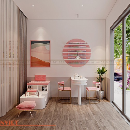 Với diện tích khá bạn chế nên Penviet cũng tận dụng khu vực tiếp khách thiết kế thêm khu vực làm Nail. Với, màu hồng, trắng làm chủ đạo, được làm từ gỗ MDF chống ẩm bộ bàn ghế trở nên rất ấn tượng với khách hàng.
