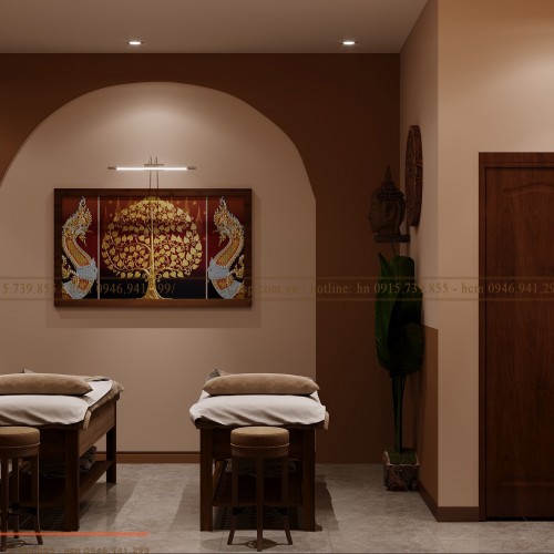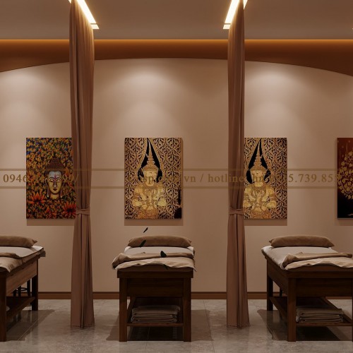 Tranh in mang màu sắc Phật Giáo – nét đặc trưng trong kiến trúc Thái Lan được chúng tôi sử dụng để trang trí cho không gian. Nó không chỉ làm toát lên tinh thần của mẫu thiết kế mà những hình ảnh này còn giúp tạo được cảm giác thư thái cho khách hàng đến làm đẹp tại spa.
