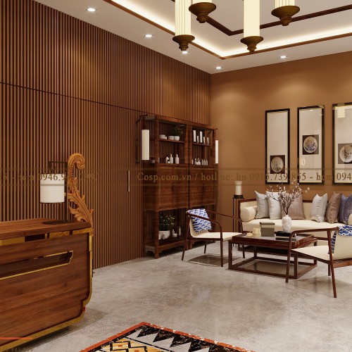 Penviet đẩy quầy lễ tân về cuối căn phòng giúp nhân viên dễ dàng bao quát toàn bộ không gian để hỗ trợ khách hàng một cách nhanh chóng, kịp thời. Kiểu dáng quầy đơn giản được nhấn nhá viền Inox mạ si vàng tạo nên vẻ sang trọng cho khu vực này.