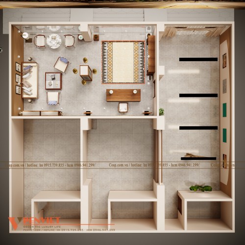 Penviet chăm chút kỹ lưỡng cho không gian phòng khách nhằm giúp họ cảm nhận được sự chu đáo và hoàn hảo trong dịch vụ của spa. Bố trí nội thất ngoài chú trọng tạo sự thông thoáng cho cửa tiệm còn giúp tạo ra những góc riêng tư cho khách hàng.