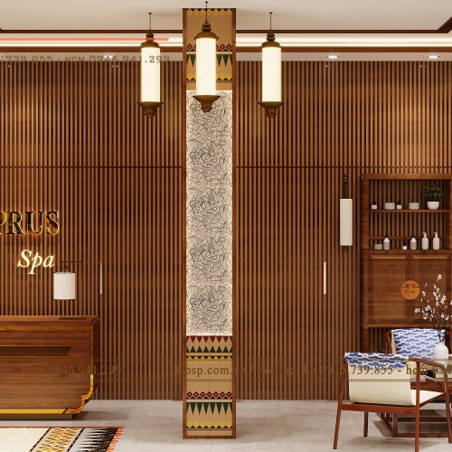Chúng tôi tập trung vào những chi tiết trang trí mang tính biểu trưng hay nội thất như khung gỗ MDF phủ Melamine, đôn trang trí phủ PVC vân giả đá tạo sự liên tưởng đến những loại vật liệu đặc trưng trong phong cách kiến trúc Thái Lan. Thảm trải sàn với họa tiết ấn tượng phong cách Bohemian tạo nên nét phóng khoáng, tự do cho thiết kế spa này.