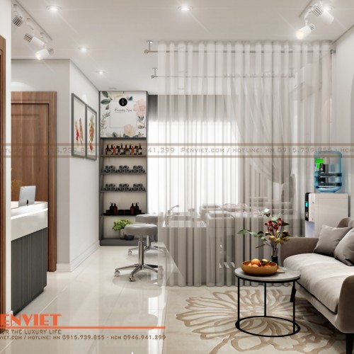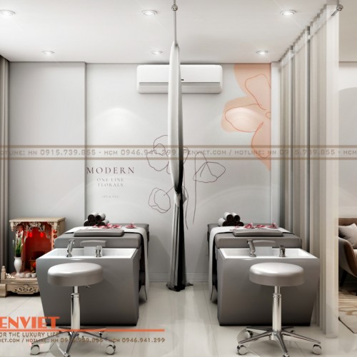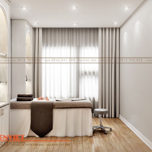 Thấy được những tiềm năng khi kinh doanh các dịch vụ làm đẹp trong khu dân cư cao cấp, nên các kiến trúc sư của Penviet đã tư vấn cho chủ đầu tư lựa chọn thiết kế spa theo phong cách hiện đại, hướng đến sự thanh lịch, cuốn hút. Gam màu chủ đạo là màu ghi nhạt, trắng giúp không gian spa thêm thoáng rộng, thoải mái.