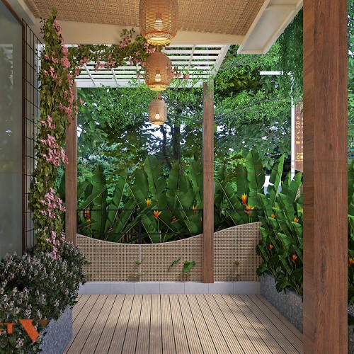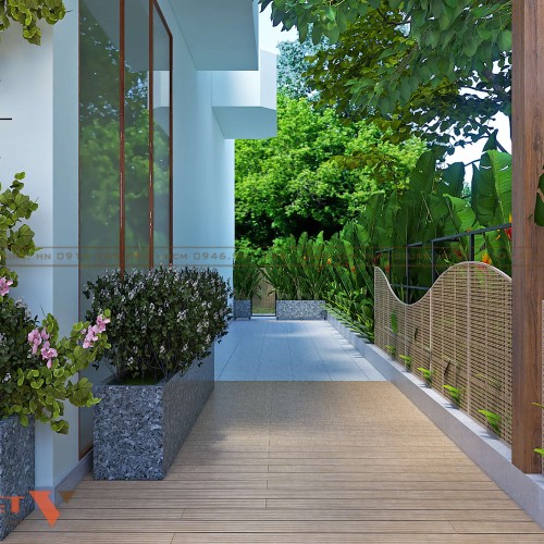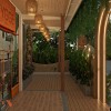 Cây xanh được bố trí hài hòa xung quanh mặt tiền, tạo nên sự tươi mát và gần gũi với thiên nhiên. Các chậu cây được đặt ở hai bên lối vào, cùng với dàn cây treo xanh mướt phía trên, không chỉ làm đẹp mà còn mang lại không khí trong lành, dễ chịu.