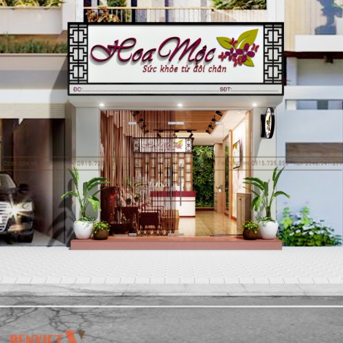 Giống như cái tên thương hiệu, spa Hoa Mộc có hệ thống biển bảng được thiết kế giản dị nhưng mang nét nổi bật riêng. Bảng quảng cáo khung sắt ốp ALu màu trắng kết hợp hệ chữ mica màu hồng tím nhẹ nhàng, nổi bật. Hơn nữa, với câu slogan “sức khỏe từ đôi chân” giúp khách hàng có thể hiểu rõ hơn về dịch vụ cung cấp, tạo nhận diện tốt.