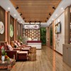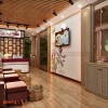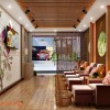Trên diện tường là các vách gỗ trang trí độc đáo, kết hợp tranh in mang màu sắc riêng, khó có thể lẫn vào đâu được. Vách gỗ mang đến vẻ đẹp mộc mạc, gần gũi đúng như tên gọi spa Hoa Mộc nơi đây.