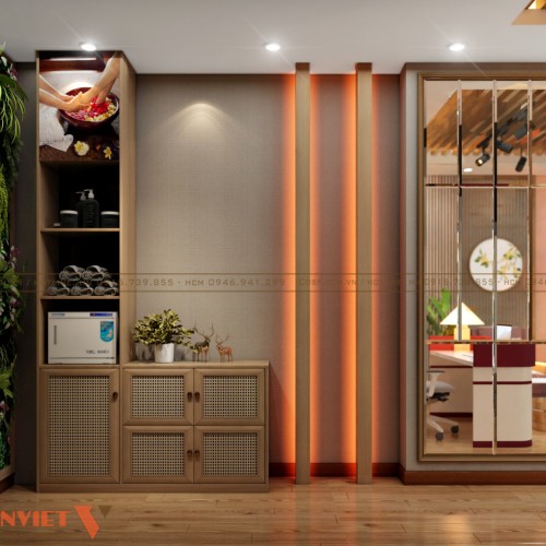 Ngay lối ra vào là khu vực setup tủ đựng giày dép cho khách hàng. Chất liệu tủ bằng gỗ MDF cốt xanh bền bỉ, kiểu dáng hiện đại và thời thượng. Vừa có công dụng bảo quản giày dép tốt vừa tăng tính thẩm mỹ cho spa.