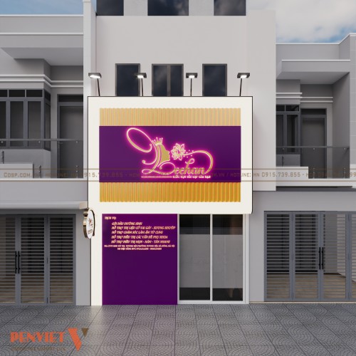 Spa Leehan của chủ đầu tư chị Diệu Hằng có hệ thống biển quảng cáo mang gam màu tím dịu dàng. Trên biển bảng có đầy đủ thông tin dịch vụ mà spa cung cấp tăng sự uy tín cho thương hiệu. Hệ biển chính và biển cột bên dưới có kích thước lớn là phương án quảng cáo hiệu quả cho spa. Chất liệu biển bảng khung sắt ốp Alu bền bỉ, tiết kiệm chi phí cùng tuổi thọ lâu dài.