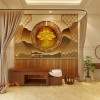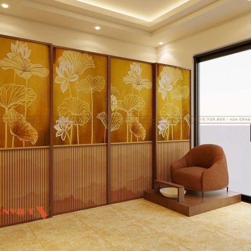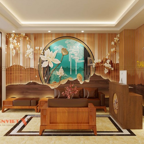 Phía sau bộ ghế sofa là vách decor trang trí các họa tiết rất ấn tượng. Điểm nhấn của khu vực này là bức tranh hình hoa sen, hoa súng tăng tính thẩm mỹ cho không gian mà còn tạo cảm giác thư giãn cho khách hàng.