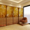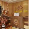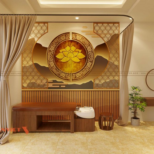 Nơi gội đầu dưỡng sinh và massage có bố trí 1 giường nằm và vách trang trí đẹp mắt. Tấm vách có họa tiết hoa sen thanh tịnh cùng các chi tiết khác tạo nên sự huyền bí, mê hoặc. Để tạo sự riêng tư cho khu vực này, PenViet sử dụng tấm rèm che mỏng nhẹ và sang trọng.