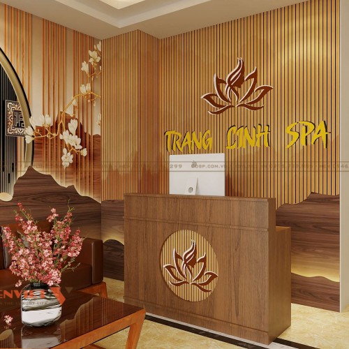 Tiếp đến là khu vực quầy thu ngân với vách logo thương hiệu tăng nhận diện cho spa. Quầy làm từ chất liệu gỗ MDF cốt xanh màu nâu cổ điển đồng nhất với phong cách spa hướng đến. Sự mộc mạc là tiêu chí quan trọng khi trang trí không gian nội thất spa Trang Linh này.