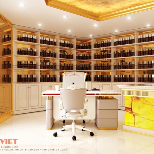 Là một trong những điểm nhấn tại tầng 1, khu vực trưng bày quà tặng trong mẫu thiết kế spa kết hợp phòng khám Hoàng Gia được Penviet setup kỳ công.