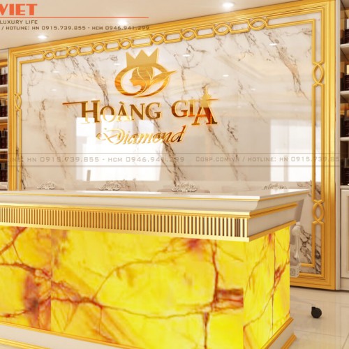 Logo và tên tổ hợp dịch vụ được khéo léo lồng ghép trong vách Logo khu vực chờ tư vấn là cách chúng tôi lựa chọn để làm tăng cường nhận diện thương hiệu cho Hoàng Gia Diamond.