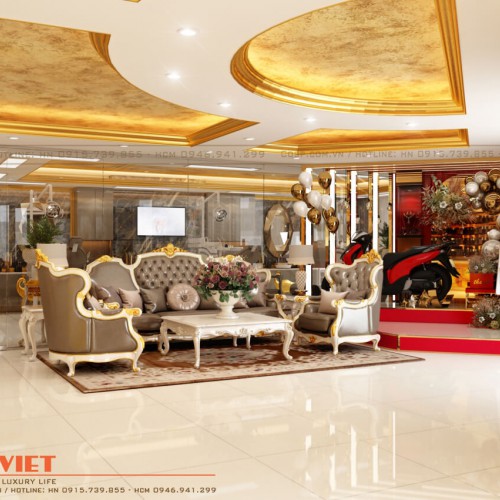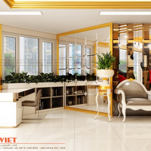 Kiểu dáng và màu sắc ấn tượng của quầy lễ tân bằng gỗ MDF chống ẩm sử dụng công nghệ sơn Inchem, mặt quầy dán phào PU sơn trắng kết hợp sơn nhũ vàng, thân quầy ốp tấm nhựa PVC xuyên sáng, chân quầy dán PU sơn trắng kết hợp sơn nhũ vàng tạo nên sự thu hút cho khu vực này. Việc sử dụng tấm ốp PVC với họa tiết vân được thiết kế riêng cũng cho thấy kỳ vọng tạo nên sự độc đáo, khác biệt so với đối thủ cạnh tranh của chủ đầu tư và kiến trúc sư Penviet.