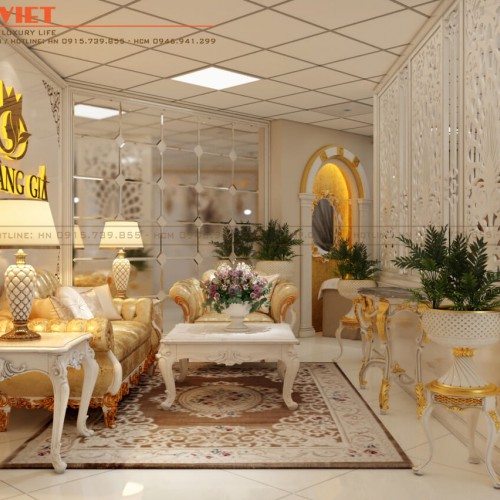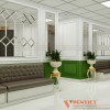 Penviet cũng giúp chủ đầu tư tăng cường nhận diện thương hiệu với thiết kế vách óp sau quầy lễ tân. Được làm từ khung gỗ sồi sơn Inchem, ốp PVC vân đá tạo độ bóng, không chỉ làm toát lên vẻ đẹp sang trọng, đẳng cấp cho không gian mà còn làm nổi bật logo và tên tổ hợp dịch vụ bằng Alu vàng gương cắt CNC, chân Formex. Những chi tiết phào chỉ trang trí quanh vách và việc lựa chọn vật liệu, họa tiết đều góp phần làm toát lên tinh thần của mẫu thiết kế nội thất spa, thiết kế nội thất phòng khám phong cách Tân Cổ Điển.