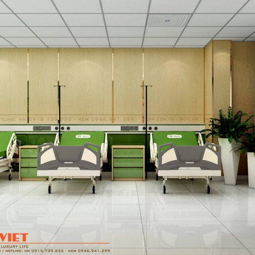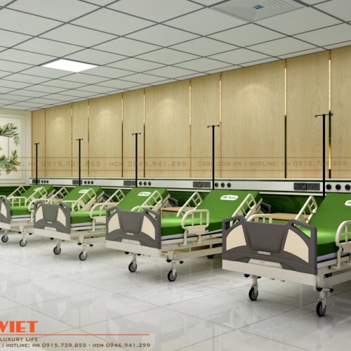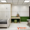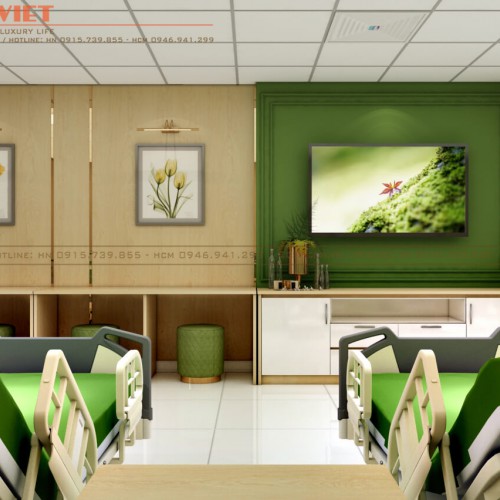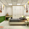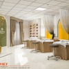 Thiết kế nội thất spa, thiết kế nội thất phòng khám trong tổ hợp dịch vụ này còn sử dụng các tab đầu giường làm từ khung bằng gỗ MDF lõi xanh cốt Thái chống ẩm sơn Inchem, đèn led cảm ứng bắt ở soi rãnh trên đợt gỗ tránh hắt sáng trực tiếp vào mắt vừa giúp mở rộng không gian lưu trữ, mang tới sự thuận tiện cũng như tạo cảm giác dễ chịu cho bệnh nhân.