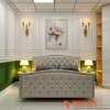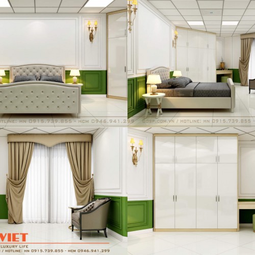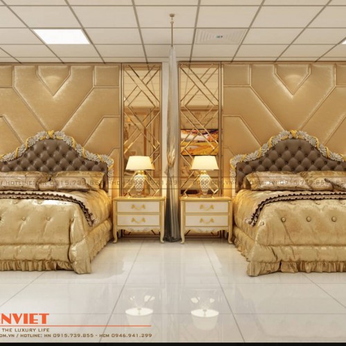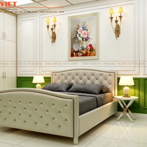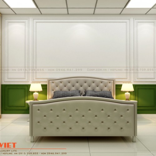 Việc lắp đặt các vách ốp đầu giường da Cleo vách gương 2 bên khung cốt MDF lõi xanh tấm Thái, mặt gương Bỉ màu trà cũng góp phần khiến cho căn phòng trở nên sang trọng, đẳng cấp.