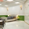 Tại phòng spa chung, Penviet sử dụng nhiều vách décor khung xương Vĩnh Tường, tấm Gyproc, thạch cao giật cấp; thân cột và vòm cột Pu sơn trắng kết hợp nhũ vàng hoàn thiện; Viền và chỉ phào cong PU, dát vàng Đài Loan; tranh in UV cùng hệ thống đèn Led tạo điểm nhấn cho không gian.