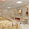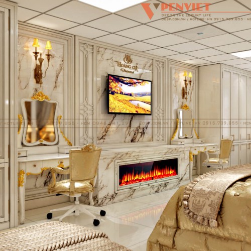 Bàn trang điểm bằng gỗ sồi đã qua tẩm sấy chống cong vênh, mối mọt sơn Inchem kết hợp nhũ vàng, gương trang trí, viền composite sơn nhũ vàng kết hợp 2 hộp đồ bằng MDF chống ẩm sơn Inchem, ghế ngồi khung bằng gỗ sồi kết hợp chân sắt, lưng và đệm ghế bọc da Carola Y nhập khẩu, mút Việt Nhật T50; Vách tivi ốp PVC vân đá, chỉ tường PU màu trắng, hệ gỗ MDF chống ẩm sơn Inchem cắt CNC làm nổi bật bộ nhận diện thương hiệu bằng Alu vàng gương cắt CNC, chân Formex hay thiết kế ấn tượng của kệ dưới tivi với lò sưởi điện trang trí 4D, dán film vân đá; khung gỗ MDF lõi xanh cốt Thái chống ẩm phủ Laminate vân đá chính là những dẫn chứng cụ thể được kiến trúc sư Penviet khéo léo đưa vào không gian.
