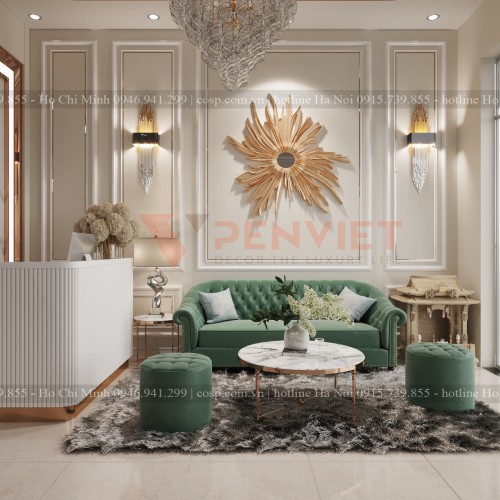 Chúng tôi lựa chọn spa gam màu xanh ngọc cho sofa chân gỗ đệm nỉ cùng kiểu dáng mềm mại, đính nút chuẩn tân cổ điển tạo sự thoải mái cho khách hàng trong khi chờ đợi được tư vấn. Gam màu này có sắc độ vừa phải mang đến sự tinh tế và tạo chiều sâu cho không gian tiệm spa. Đồng thời kết hợp với bàn trà chân inox sơn mạ xi vàng cùng mặt bàn vân đá nhân tạo, để mang tới sự đồng bộ và toát lên vẻ đẹp cổ điển nhưng vẫn hiện đại.