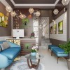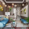 Mảng tường được dán giấy giả gạch, cùng với đó là bộ ghế sofa có màu xanh ngọc vô cùng hiện đại và tiện nghi. Phong cách hiện đại hòa quyện với những chi tiết mang đậm nét truyền thống tạo nên một không gian hài hòa và phong phú.
