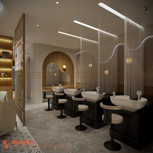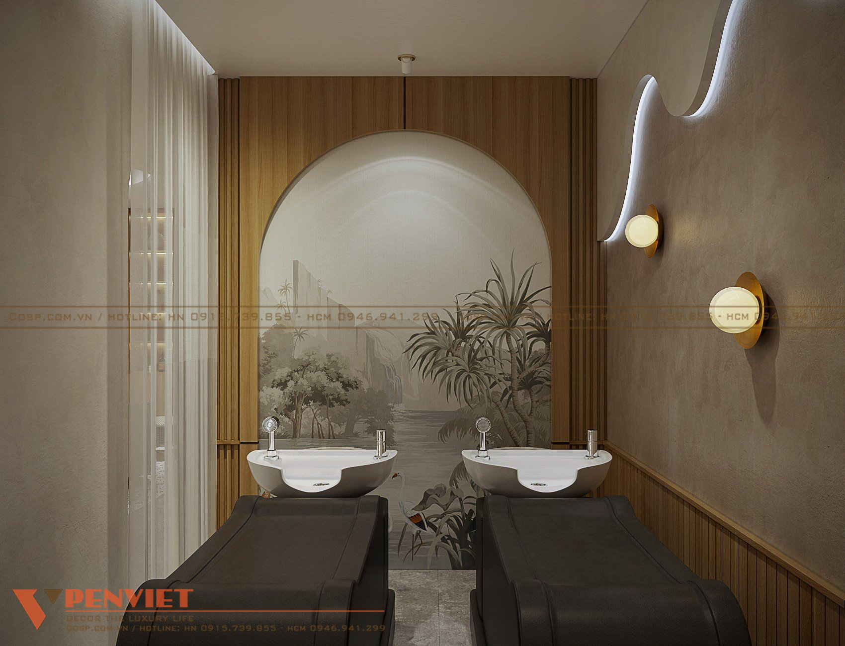 Góc bên phải của khu vực tư vấn có bố trí các ghế nằm gội đầu với rèm che đảm bảo sự riêng tư cho khách hàng. PenViet sử dụng nguồn ánh sáng dịu nhẹ để tránh khách hàng bị chói mắt khi nằm tận hưởng dịch vụ gội đầu.