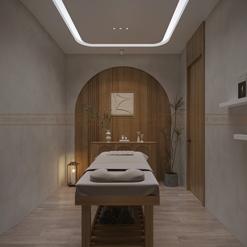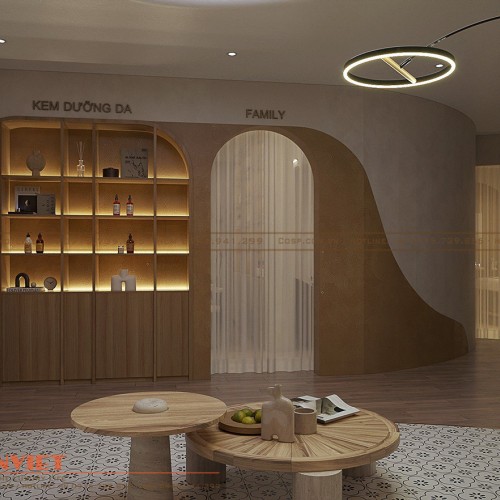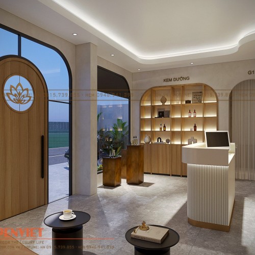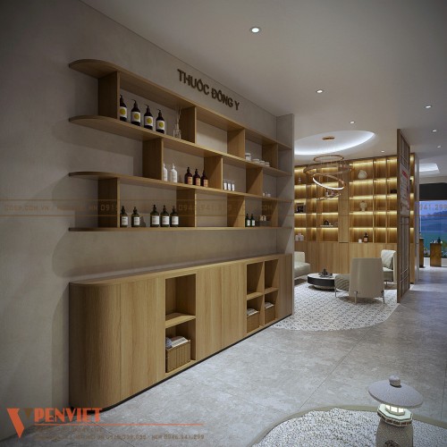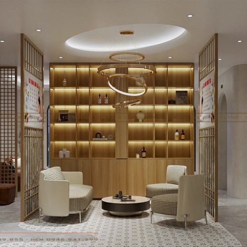 Ngoài ra, tại đây còn có dãy tủ trưng bày các dòng sản phẩm đông y chăm sóc sắc đẹp và sức khỏe. Hệ tủ thiết kế bo tròn đẹp mắt, có nhiều ngăn trưng bày giúp chủ spa có thể giới thiệu nhiều dòng sản phẩm khác nhau.