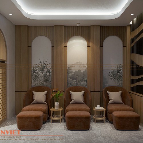 Bước vào bên trong là nơi chăm sóc khách hàng với các gói dịch vụ về chân, gội đầu. Khu vực chính giữa là bàn tư vấn của spa, góc bên trái là nơi bố trí các ghế ngồi chăm sóc chân, bên phải là ghế nằm gội đầu. PenViet thấu hiểu các quy định khi bố trí thiết bị spa nhằm đảm bảo sự thuận tiện nhất cho nhân viên làm việc và tính thoải mái cho khách hàng.