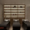Phía bên trái quầy lễ tân được bố trí hệ thống kệ tủ đựng mỹ phẩm của spa. Những loại mỹ phẩm khác nhau được bài trí đan xen kết hợp hiệu ứng ánh sáng đèn LED tủ trở nên lung linh, kích thích người nhìn hơn.