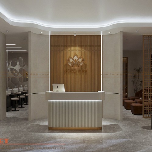 Spa & Đông Y HANA KIM cung cấp dịch vụ chăm sóc sắc đẹp và trị liệu đông y chuyên nghiệp. Khi bước chân vào spa, khách hàng sẽ bắt gặp khu vực quầy tư vấn để hỗ trợ mọi thông tin cần thiết. Quầy lễ tân làm từ gỗ MDF cốt xanh Thái Lan chống ẩm với thiết kế rãnh được sơn màu cao cấp rất ấn tượng. Bên cạnh đó, mặt bàn ốp đá marble, chân sắt sơn nhũ vàng kết hợp đèn LED phát sáng thân quầy vô cùng nổi bật.