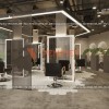 Bốn bức tường đều được tận dụng để thiết kế khu vực cắt tóc. Gương được gắn xunh quanh vừa phục vụ công việc cho thợ cắt tóc vừa giúp không gian phòng rộng rãi hơn.