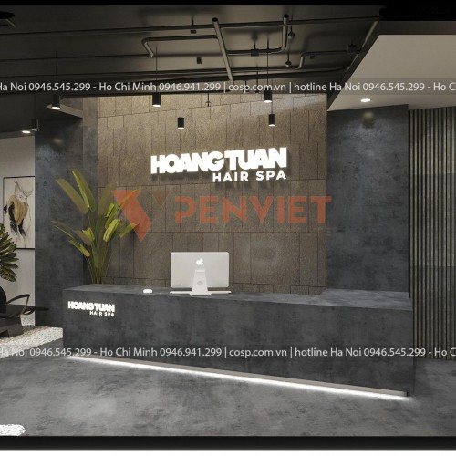 Phía bên phải là khu vực thanh toán - quầy thu ngân. Bàn thu ngân được làm từ khung gỗ MDF cốt xanh chống ẩm 9li An Cường. Phía sau là bức tường ốp gạch giả đá có tên thương hiệu Logo mica phát sáng mặt chân nổi 3cm chữ "Hoang Tuan Salon". Khu vực quầy rộng rãi, khách hàng cũng như nhân viên thoải mái đi lại, hoạt động, chăm sóc tư vấn khách hàng.