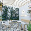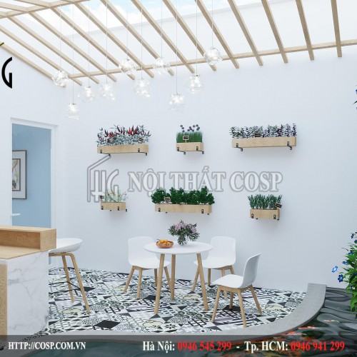 Nội thất gồm: bàn ghế, trên tường có kệ để một số hương liệu và vật dụng trang trí nhỏ, ở góc tường phía bên cạch là những 6 chiếc kệ trồng một số loài hoa và cây xanh tươi đẹp rực rõ. Sau khi sử dụng dịch vụ spa, mọi khách hàng sẽ có được khoảng thời gian để ngắm nhìn bầu trời, giảm stress, thư thái tinh thần.
