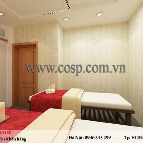 Tầng 2 của cửa hàng bố trí các phòng dịch vụ để phục vụ khách hàng. Các phòng này được thiết kế đơn giản, không trang trí cầu kỳ. Tường được trang trí bằng giấy dán tường màu nude có họa tiết trang nhã, thanh lịch. Hai chiêc giường spa chắc chắn với gỗ tự nhiên chống ẩm tốt, bên trên là đêm êm ái tạo cho khách hàng khoảng thời gian thoải mái.