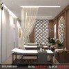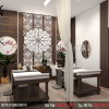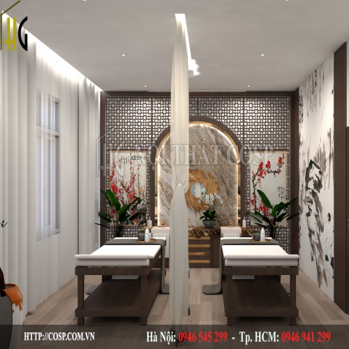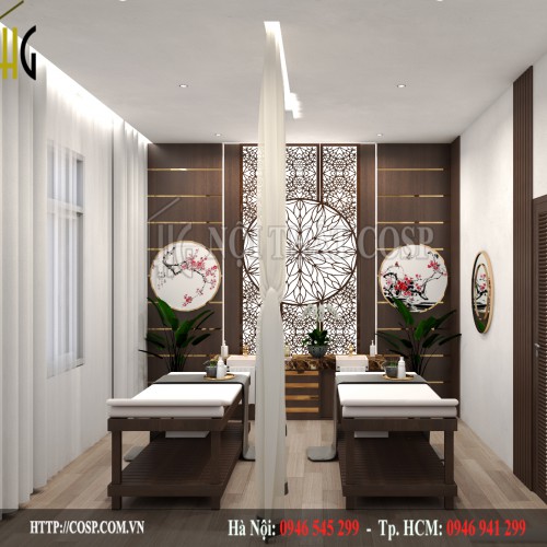 Tại phòng dịch vụ, chúng tôi lấy tông màu chủ đạo là trắng, nâu gỗ và xám ghi, chúng tôi đã phối kết hợp rất khoa học. Trắng của trần nhà, tường nhà và những chiếc rèm lụa cao cấp, nâu của những chiếc giường massage cao cấp và của bộ cửa. Hai màu kết hợp với nhau khiến cho spa thêm bí ẩn, đồng thời làm nổi bật phong cách thiết kế tân cổ điển của spa.