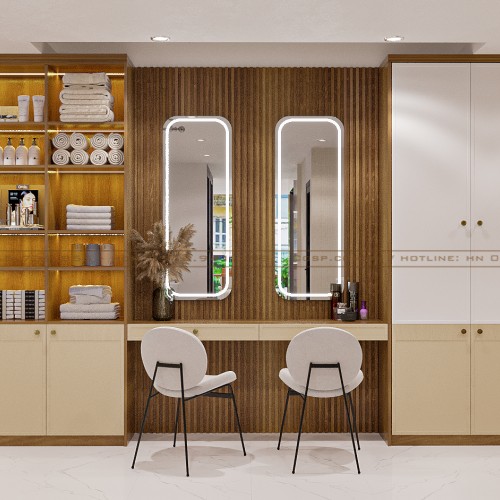 Cuối cùng là không gian bàn trang điểm và tủ đựng dụng cụ cần thiết cho spa. Tại đây quý khách có thể thoải mái ngắm nhìn bản thân trước các tấm gương soi hình chữ nhật bo tròn mềm mại.