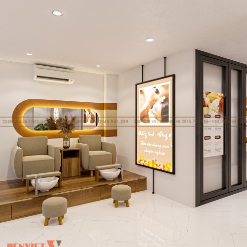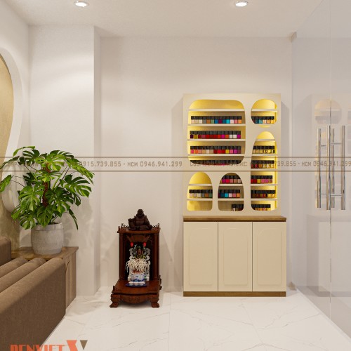 Ngay của ra vào của spa, quý khách sẽ nhìn thấy tủ trưng bày các loại sơn móng tay, nail ấn tượng của chủ tiệm. Tủ có thiết kế với nhiều đường cong tạo sự mềm mại cho tổng thể không gian. Bên trong tủ còn bố trí đèn LED tạo hiệu ứng ánh sáng, tăng thêm phần nổi bật cho sản phẩm trưng bày.