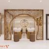 Vách logo, kệ mỹ phẩm có họa tiết vòm cong tạo sự gần gũi