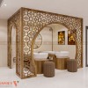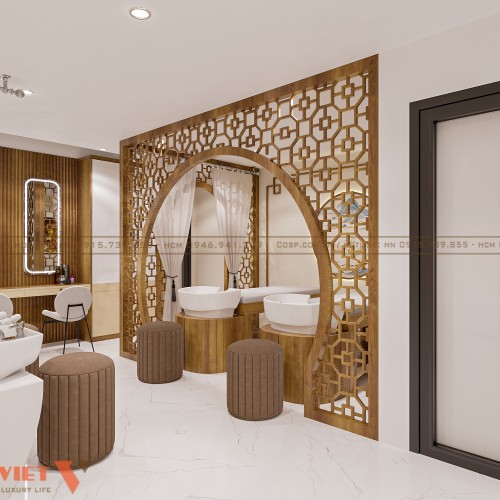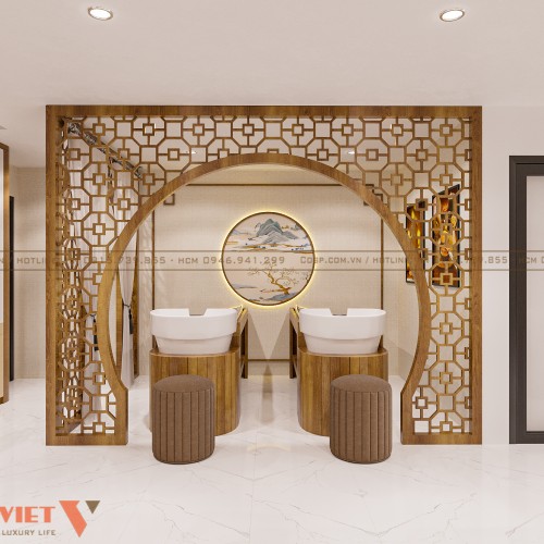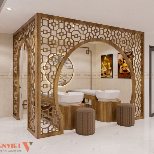 Khu vực này ngăn cách với các không gian khác là mẫu vách gỗ họa tiết Trung Hoa độc đáo. Họa tiết đồng tiền xu Trung Hoa đan xen nhau tạo nên sự riêng tư cho khu vực này. Tại đây có bố trí 2 giường dịch vụ để đáp ứng nhu cầu quý khách hàng đến trải nghiệm.