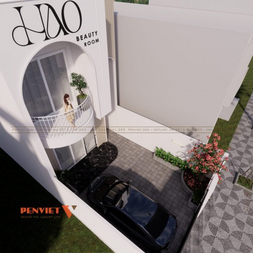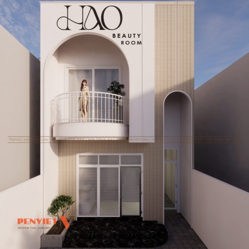 Spa Hao bố trí ngay trong khuôn viên tòa nhà 2 tầng nên có phần mặt tiền khá ấn tượng. Trong đó, dòng chữ "HAO Beauty room" nổi bật trên nền sơn trắng tạo ấn tượng mạnh mẽ ngay từ cái nhìn đầu tiên. Sự kết hợp giữa màu trắng và be tạo ra một cảm giác tươi mới và hiện đại. Đặc biệt, chi tiết mái vòm tại mặt tiền là một điểm nhấn độc đáo, giúp spa nổi bật giữa những công trình xung quanh.