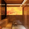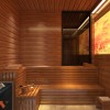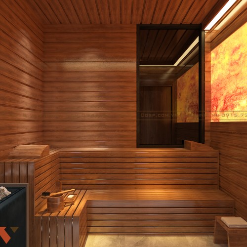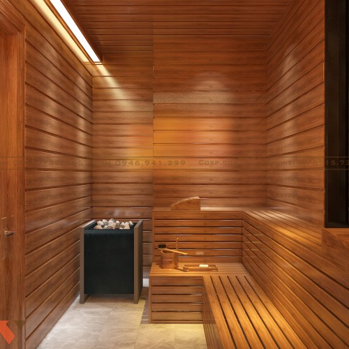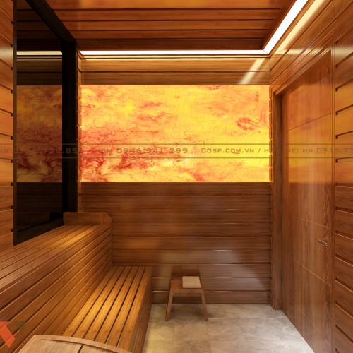Toàn bộ căn phòng được ốp vách bằng chất liệu gỗ thông tự nhiên. Đây là chất liệu gỗ phù hợp cho phòng xông hơi, bền bỉ và thẩm mỹ.