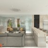 Cách chi tiết lượn sóng mềm mại từ trần nhà cho đến bàn quầy bar hay vách kính ngăn phòng tạo nên cho không gian cảm giác dễ chịu, không quá khô cứng.