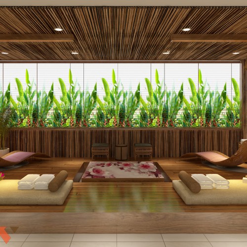 Khu vực tầng 6 của spa được phân bổ làm sảnh tiếp đón khách, phòng dịch vụ spa và phòng xông hơi. Mỗi khu vực đều được phân bố nội thất hợp lý, tăng tính chuyên nghiệp.