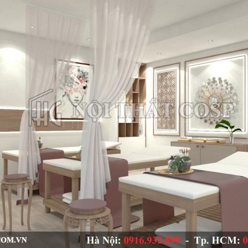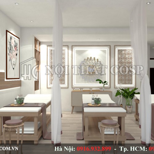 Với không gian rộng và có thể bố trí được nhiều giường spa, Penviet đã khảo sát thực tế và đưa ra thiết kế phòng spa với 4 giường. Các giường này được ngăn cách bởi rèm che tạo sự riêng tư và thoải mái cho khách hàng. Đồng thời, các mảng tường cũng được trang trí với tranh ảnh hay ốp gỗ tạo sự mới lạ và khác biệt.