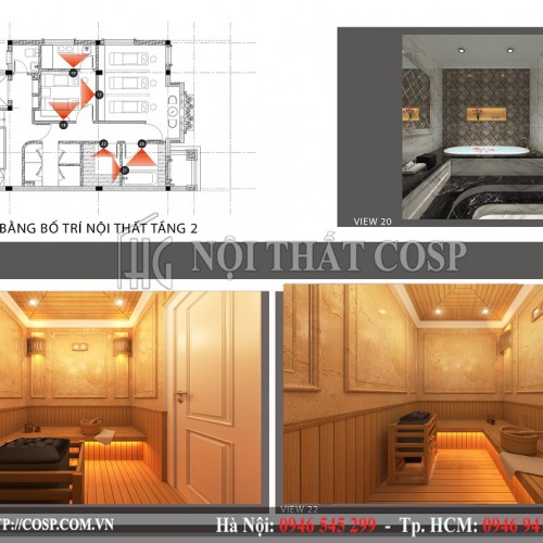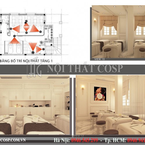 Tầng 2 được chúng tôi bố trí 2 phòng massage cùng các phòng xông hơi tạo nên không gian tuyệt vời để khách hàng trải nghiệm dịch vụ làm đẹp cao cấp. KTS đã khéo léo trang trí thêm 1 số loại cây xay tươi mát tạo điểm nhấn cho không gian tầng 1 thêm thu hút. Vừa có thể tạo thêm không khí trong lành cho căn phòng, vừa làm căn phòng đỡ thô ráp vừa tạo nên sự thích thú với khách hàng, giúp việc giao tiếp với nhân viên trở nên cởi mở, tự nhiên hơn.