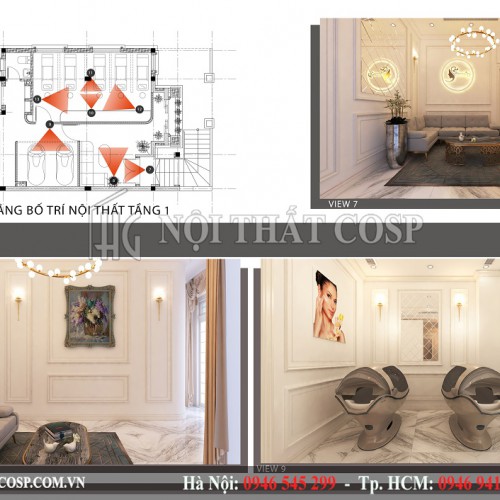 Tầng 1 gồm 2 phòng spa và 1 phòng chờ có ban công thoáng mát giúp khách hàng có thể hóng mát trong thời gian chờ. Hệ thống đèn sử dụng tại thiết kế spa đều theo phong cách tân cổ điển với ánh đèn dịu mắt giúp không gian trở nên sang trọng và tạo cảm giác thư giãn cho khách hàng.